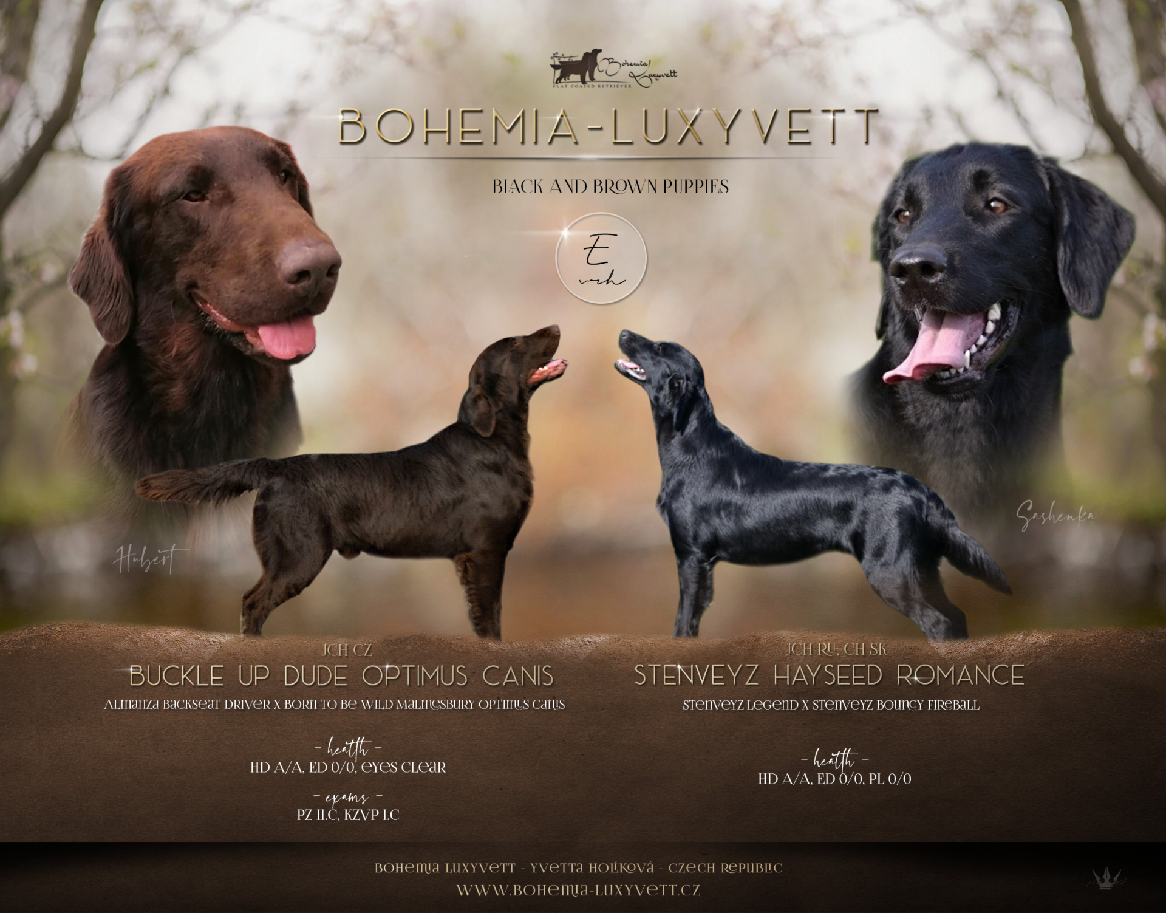 Máme také importovanou fenečku ze Švédska CHCZ, CHSK CALZEAT DOWNTON ABBEY, ta má v rodokmenu jednoho z nejlepších flatíků v Evropě a severských státech, který byl res.BIS na nejprestižnější výstavě světa Crufts